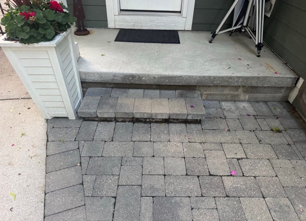 Before & After photos of a project we just finished for our client in Birmingham Mi. We removed and concerted all the failing incorrectly built step and porch systems to limestone treads and surround for a stronger longer set up and much better safety. We replaced an incorrect garden bed wall with the right matching block and corrected foundation. We also removed all the cobble stone, put in a corrected base and converted the area to pavers for a larger patio living space. We then power washed all the paver jointing clean and put in fresh polymeric sand everywhere. These suttle changes really change thd functionality and apperance drastically especally with a larger common patio area. Call us to enhance your space today !